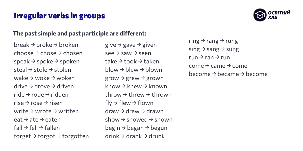 Далі — неправильні дієслова. Вони не підкоряються правилу verb + ed, тому тут важлива стратегія запам’ятовування.